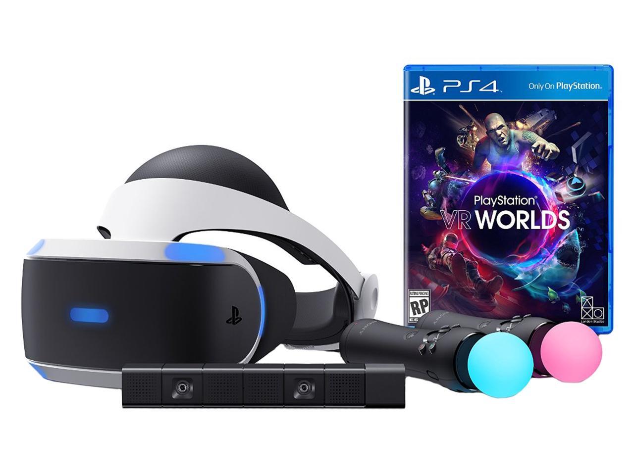 Includes: VR headset, Processor unit, VR headset connection cable, HDMI cable, USB cable, Stereo headphones, AC power cord, AC adaptor, PlayStation VR Demo Disc, PlayStation Camera, 2 PlayStation Move motion controllers, and PlayStation VR Worlds Game Disc