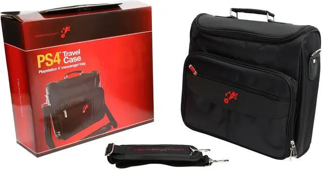 The TekNmotion PlayStation 4 messenger bag allows you to transport your Console and accessories with ease and style. With quality material and double stitched seams, this bag is sturdy and durable to protect against scratches and bumps while on the go. A main compartment, mesh pocket, accessory bag and five-disc storage accommodate and organize your arsenals and favorite games, perfect for quick runs to a friend’s house for an evening of gaming. It also features detachable shoulder straps and a rugged handle, allowing you to carry the way you like.