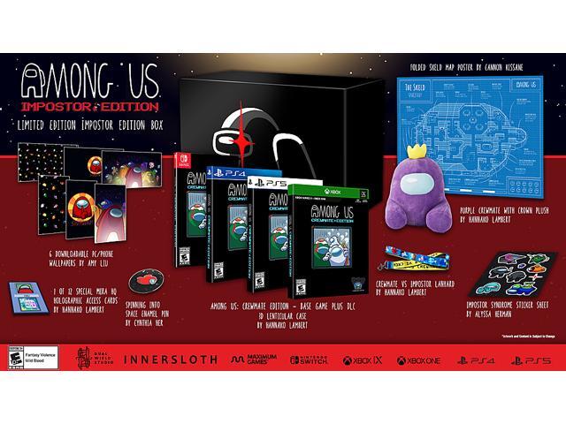 Among Us Imposter Edition Includes: Among Us: Crewmate Edition base game and all of the DLC items: Airship, Polus and MIRA HQ Skins, and Hamster Pet, Bedcrab Pet, Brainslug Pet, Stickmin Pet, and Mini Crewmate bundles