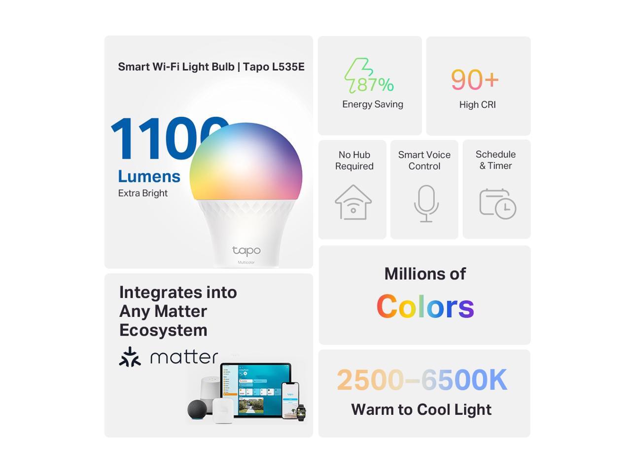 - Extra Bright 1100-Lumen Light: Tapo L535E provides 1100 lumens of crisp, high-quality lighting, which is brighter than most standard 800-lumen smart color bulbs.