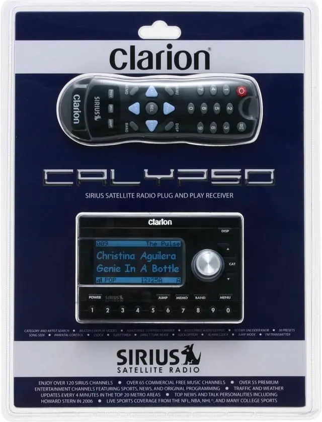 With 120 channels to choose from, finding what you want may seem difficult, but no with Clarion's Calypso. Outfitted with Sirius' S-Seek feature, Calypso will prompt users when one of their pre-selected favorite songs is playing. The unit also features 30 presets, an easy-to-use rotary knob for channel navigation, as well as category, artist, and music-title scan. Cosmetically stunning, Clarion's Calypso touts an attractive piano-like finish, and techno-blue illumination. For visibility, Clarion outfits this portable unit with an attractive 128?48 Dot Matrix Graphic Positive Display, which scrolls artist, song and channel information across the screen, and offers two selectable font sizes for increased visibility.