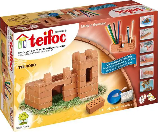 | Features | The Teifoc Castle Brick Construction Set is a unique build and play system that uses real reusable bricks and building plans to create fun and elaborate structures and creations. The cement is safe and soluble in water so that the bricks can be reused again and again. This set includes 2 detailed construction plans and the following materials: 81 assorted bricks, bag of cement mortar and a mixing bowl with masonry trowel. The Cement bag gives you extra mixing cement so you can continue to create your marvelous structures! Teifoc is totally safe and adequate for children. To dissolve the cement, leave the building in water for 2 hours. Then rinse the bricks, leave them to dry, and start all over again using new cement. Begin your building adventures today with the Teifoc Castle Brick Construction Set! |