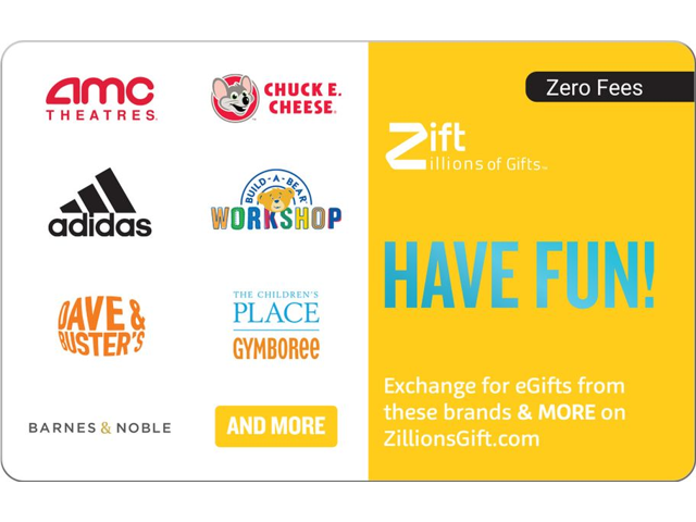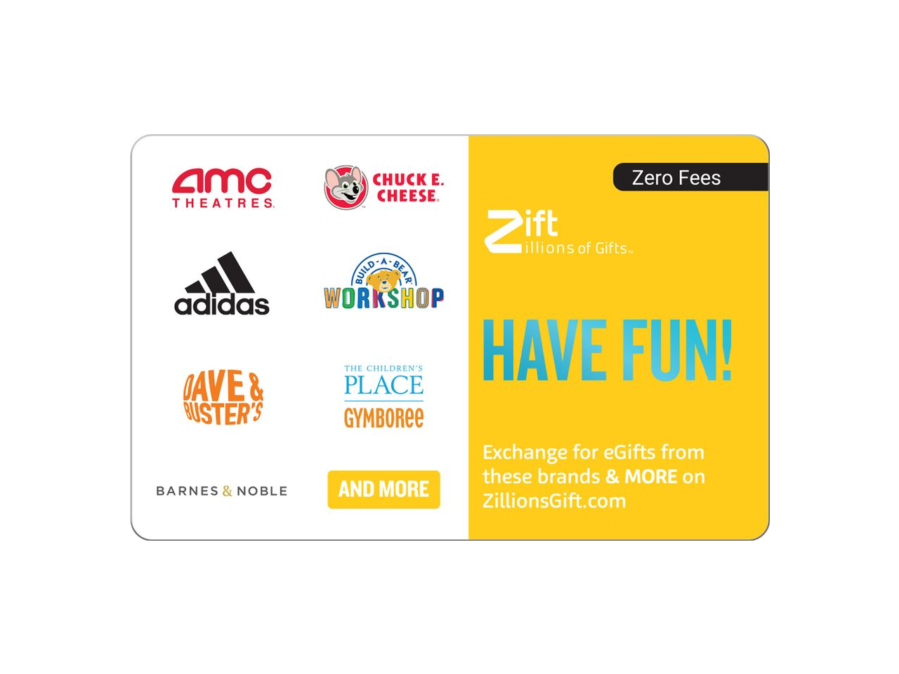 This no fee eGift Card allows the recipient to redeem for eGifts to a variety of their favorite brands such as Chuck E. Cheese, adidas, Build-A-Bear Workshop, Dave & Buster's, The Children's Place, Barnes & Noble, AND MORE!