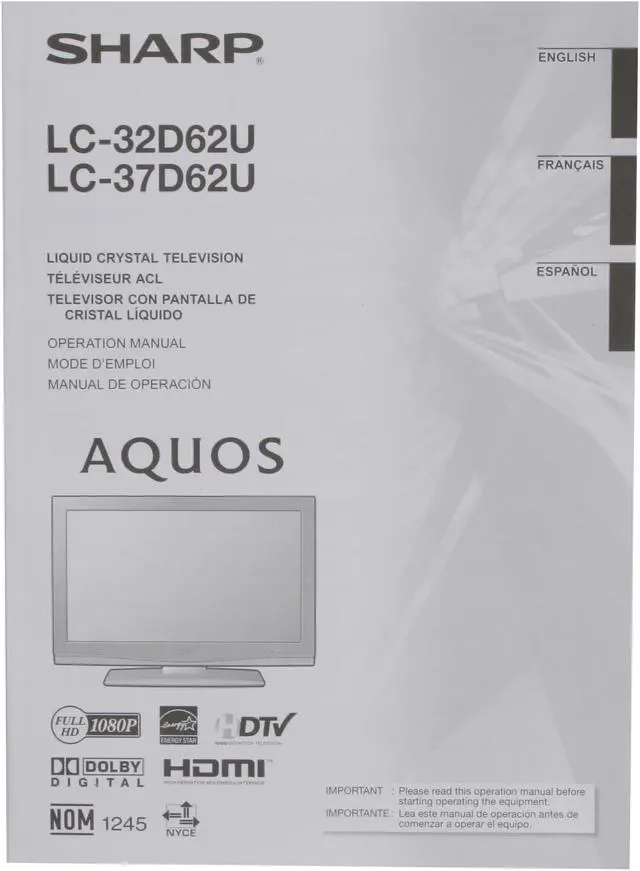 Sharp raises the bar, again. Presenting the Aquos LC32D62U. Full 1080p resolution, 10,000:1 dynamic contrast ratio, 6ms response time and a 450 cd/m² brightness rating combine to give you a brilliant LCD viewing experience.