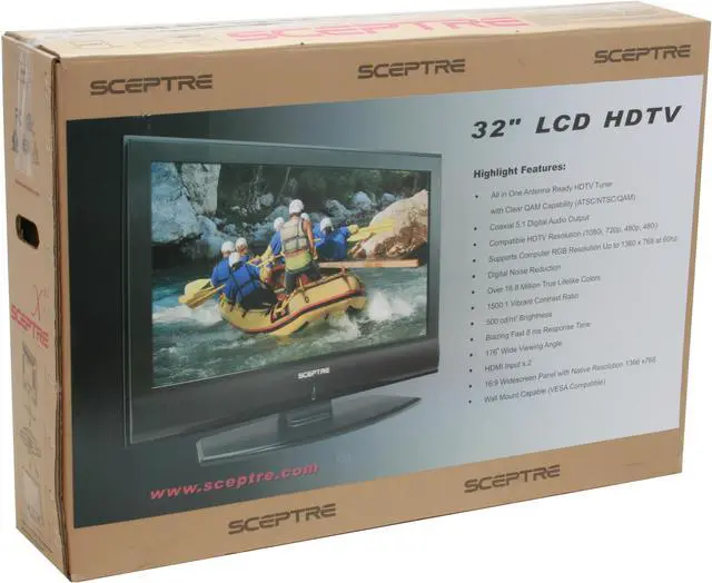 HDTV ReadyWith a maximum resolution of 1366x768 (16:9), the widescreen Sceptre X32BV-Naga+ fully supports up to HDTV 720p (1280x720, progressive) for a truly high-definition experience.