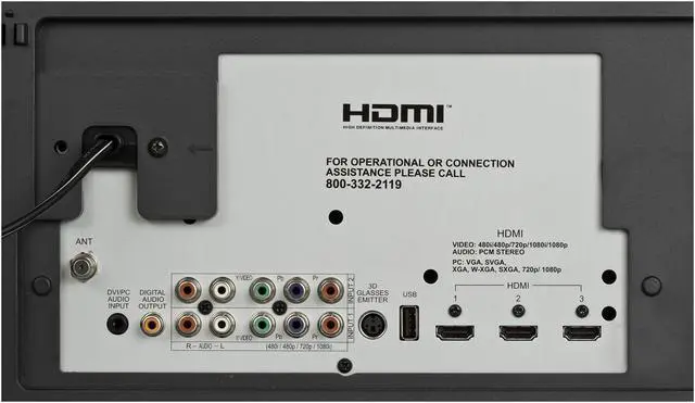 | Connectors | Component/Composite Combined Video Inputs: 2 HDMI Inputs: 3 Digital Coaxial Audio Output (Dolby Digital / PCM): 1 Antenna (RF) Inputs: 1 3D Glasses Emitter: 1 |