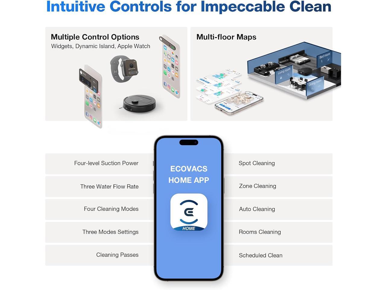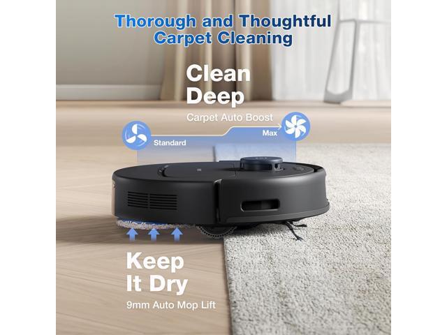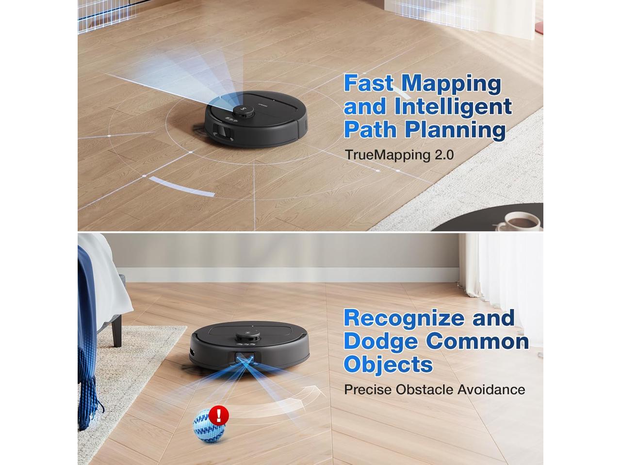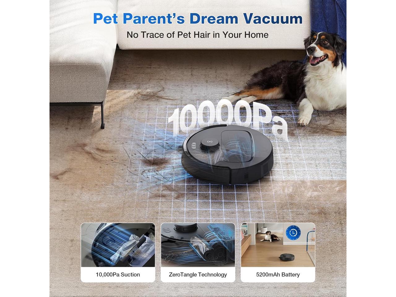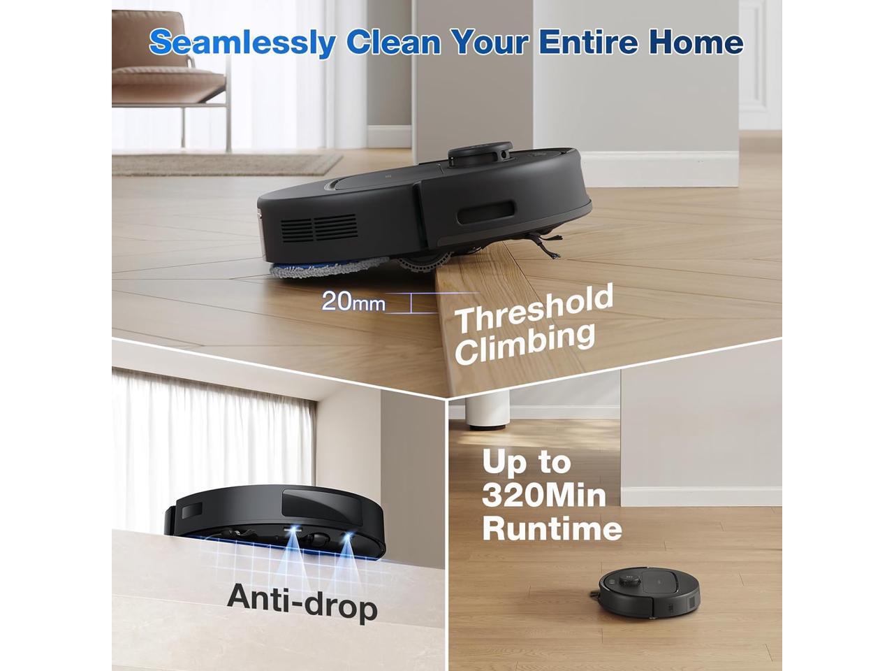 - 10,000Pa suction that deep-cleans surfaces, removing dirt from hardwood floors, tiles, and carpets