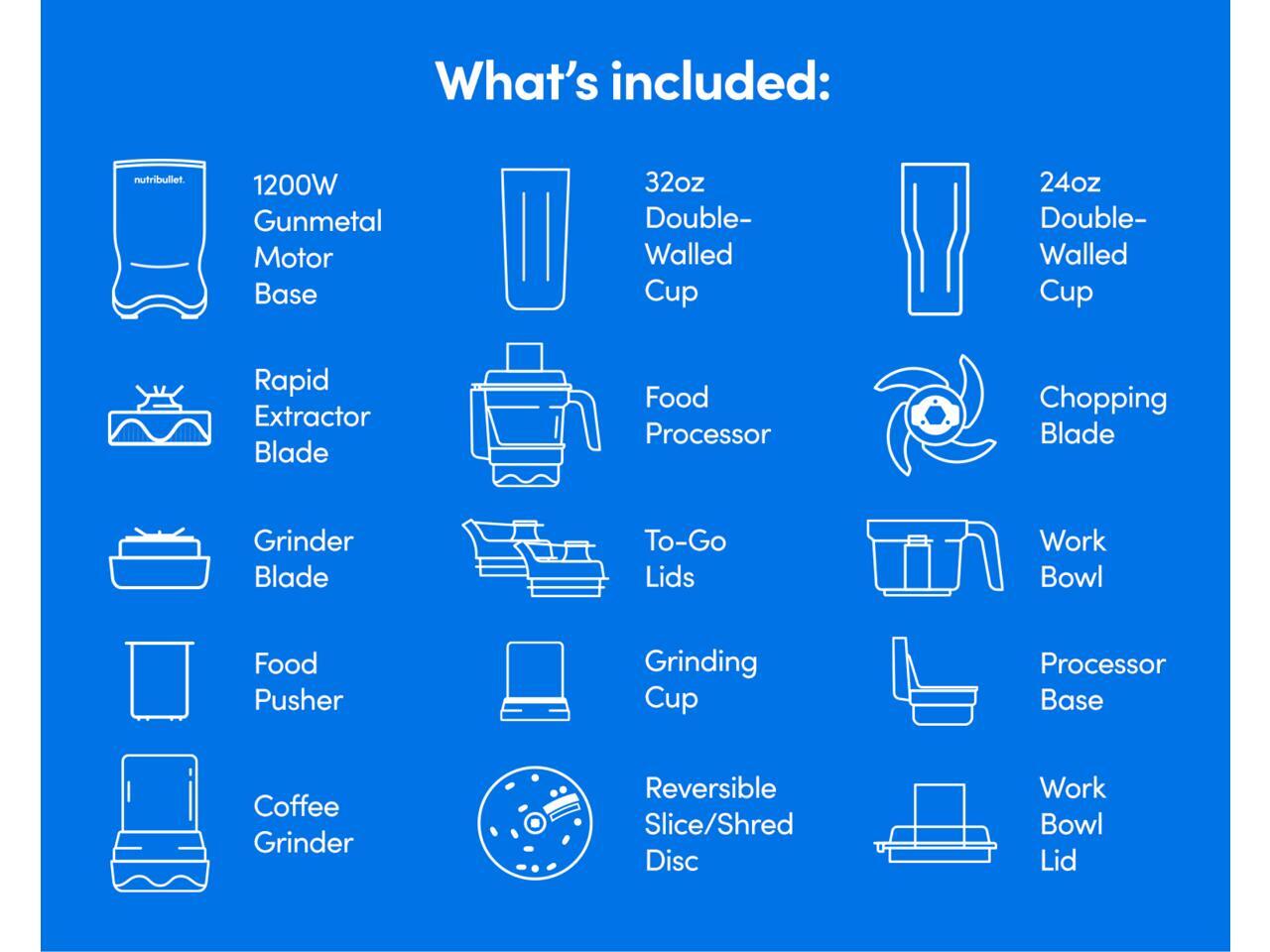 - Included: 1200-Watt motor base, rapid extractor blade, 2-cup food processor, chopping blade, slice/shred disc, coffee and spice grinder attachment, 32 oz. blending cup, 24 oz. double wall blending cup, 2- to go lids, and user guide