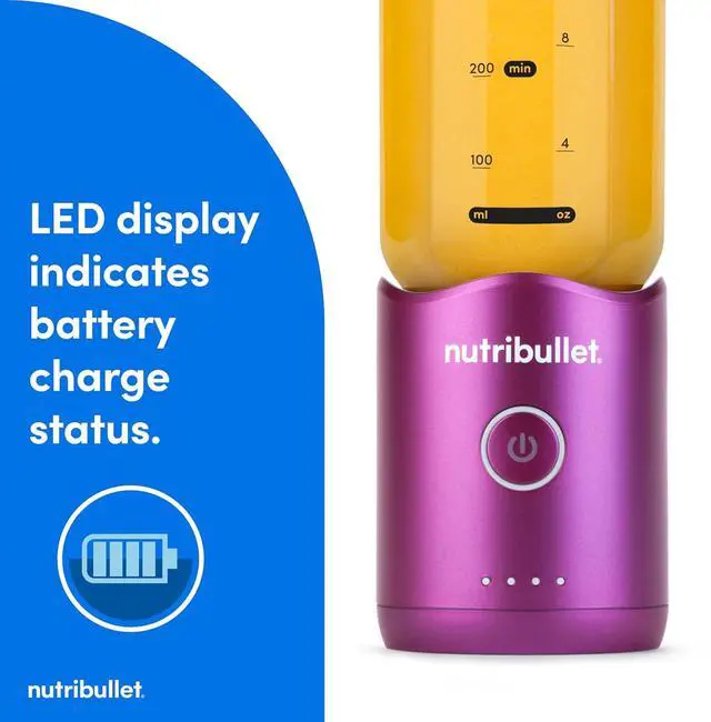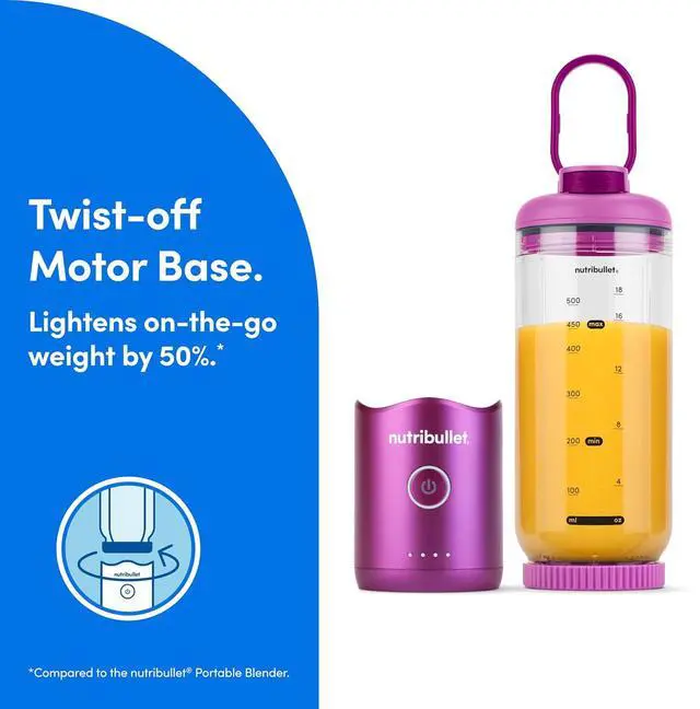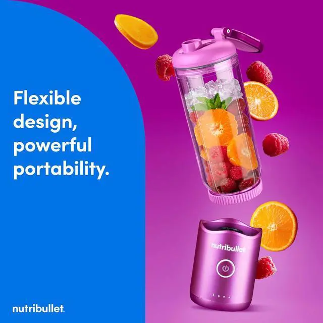 | Features | Flexible design meets powerful portability in the nutribullet Flex™, an innovative portable blender made for life on the move. Its unique twist-off Motor Base detaches from the Blending Cup, so you can sip on the go without the extra weight. A leak-proof sip lid and carry loop offer convenient transport, while 7.4V of rechargeable power deliver silky blends, every time. It also features an innovative, dishwasher-safe detachable blade for effortless cleanup – no deep scrubbing required. An innovative portable blender featuring a twist-off Motor Base for easy, lightweight transport of your favorite blends on the go, plus a removable, dishwasher-safe blade for easy cleanup. Twist-off motor base lightens on-the-go weight by 50%* *Compared to the nutribullet ® Portable Blender 7.4V motor and refined blade technology for smoother blends. Leak-proof to-go lid with carry handle for convenient transport. Sipping spout with flip-top lid for mess-free drinking on the go. LED display on Motor Base indicates battery charge status. USB-C charging cable included. Innovative detachable, dishwasher-safe blade. Nutribullet®'s quietest portable blender.* ?*Compared to the nutribullet Portable Blender and the nutribullet Flip™ Portable Blender.? Specifications: 7.4V Motor Base, Unit Dimensions (LxWxH): 3.3x3.3x12", Weight: 1.9 lbs., 11+ blends per charge |