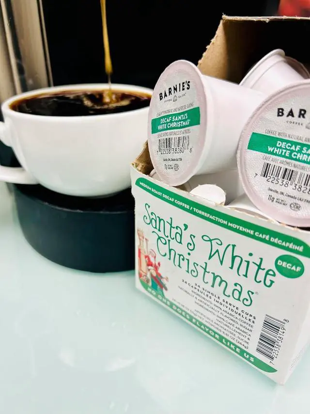 | Features | Coconutty, Caramel and Vanilla Christmas is served. First introduced as a Barnie's Coffee holiday blend in 1995, Santa's White Christmas quickly became a year-round best seller. This festive, single serve cup combines coconut, sweet caramel, vanilla and nutty flavors to satisfy your craving for something smooth, rich and wonderful. After all this time, this aromatic, tasty brew is still unforgettable.
