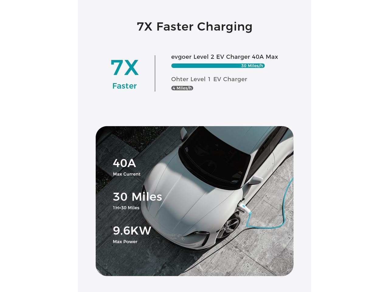 - 7X Faster Charging: The Level 2 EV charger (40 Amp, 240V) offers charging speeds up to 7 times faster than a standard wall outlet (Level 1)