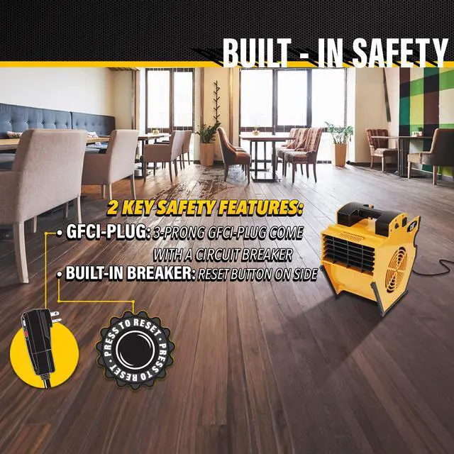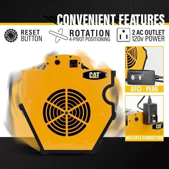 | Feature | Introducing the Caterpillar® fan CF-B1200-YW Industrial Multi Pivoting 4-Speed Utility Blower Equiped With A GFCI Plug: Your Ultimate Indoor Utility Solution for Medium to Large Spaces! When it comes to robust indoor ventilation, drying, and cooling for medium to large-sized areas, the CF-B1200-YW Industrial Multi Pivoting Utility Blower sets a new standard. This powerhouse is designed to meet all your indoor utility needs, from enhancing air circulation to rapidly drying surfaces, and maintaining a comfortable environment. **Unrivaled Power and Precision:** Boasting a formidable 1/3HP motor, this utility blower delivers an astounding 1200 cubic feet per minute (CFM) of air movement. With four-speed settings at your fingertips, you have precise control over the airflow, making it perfect for a wide range of indoor applications. Whether it's a warehouse, gym, workshop, or commercial space, this blower ensures impeccable air quality and comfort. **Built-in Circuit Breaker and Reset Button:** Safety and convenience are paramount with the CF-B1200-YW Utility Blower. It features a built-in circuit breaker and a handy reset button, ensuring your equipment remains safeguarded from unexpected electrical surges. You can confidently work or relax, knowing that your blower is equipped to handle any power fluctuations. **Versatile Multi-Pivoting Design:** The CF-B1200-YW's innovative multi-pivoting design empowers you to direct the airflow precisely where it's needed most. Whether you're cooling a large area, expediting drying times, or enhancing overall ventilation, this blower's flexibility ensures optimal performance every time. **Two Grounded AC Outlets:** Need to power additional devices or equipment within your workspace? No problem! The CF-B1200-YW is equipped with two grounded AC outlets, allowing you to conveniently plug in other tools or devices right at the source. Say goodbye to clutter and tangled cords. **Indoor Use Excellence:** |