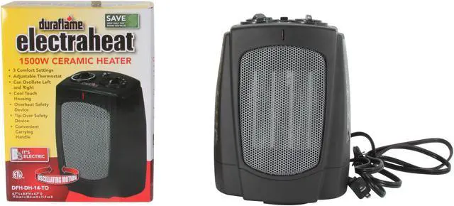 | Feature | 2 heat settings - 900W - 1,500W - Also has a fan only mode Durable powder coated steel grill Safety thermal protection Adjustable thermostat Integrated carry handle Tip-over switch Located on the base, the tip over switch is an added safety feature which will automatically disengage the heater should it get knocked over Oscillating Features an oscillating base plate to provide wider heat distribution |