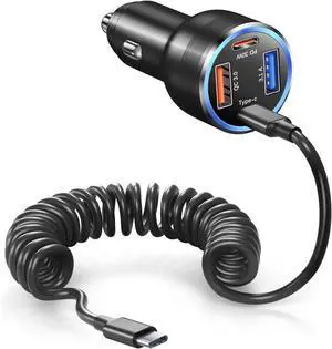 USB C Car Charger, Bangfun 65W 4-Port Dual 12V USB Car Power Charger PD&QC3.0 Fast Charging Cigarette Lighter Adapter Plug for iPhone 15 16 Pro Max iPad Samsung S25+5ft Type C Coiled Cable (Black)