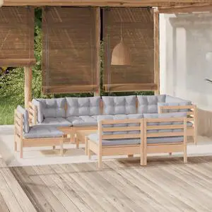 vidaXL Solid Pinewood Patio Lounge Set 9 Piece with Gray Cushions Garden Sofa
