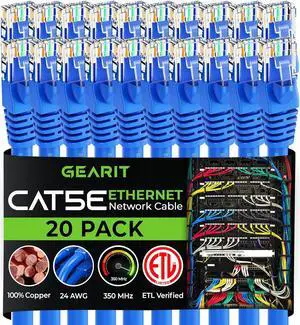 GearIT 20-Pack, Cat5e Ethernet Patch Cable 5 Feet - Snagless RJ45 Computer LAN Network Cord, Blue