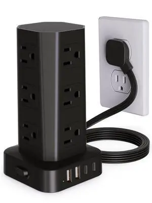 Power Strip Tower Surge Protector, 6FT Flat Plug Extension Cord with Multiple Outlets, 12 AC Outlets 4 USB (2 USB C), Desktop Charging Station with Surge Protection for Home Office Dorm Room, Black