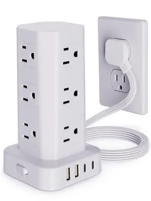 Power Strip Tower with Multiple Outlets, Flat Plug Surge Protector Tower Extension Cord with 12 AC Outlets 4 USB Ports (2 USB C), 6FT Cord Power Tower Surge Protector for Home Office Dorm Room, White