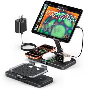 Magnetic Wireless Charging Station with 45W Adapter for Apple Devices, 20W Fast Foldable Wired Charging Stand for iPad with Clock & Night Light, Fast Mag-Safe Charger for iPhone 17, iWatch & AirPodsPart Number: Y21MAX-APPLE-vic-CHFMaterial: AluminumColor: BlackSpecifications: ?6 in 1 Magnetic Charger for Apple Decive; ?Compatible with MagSafe; ?45W Fast Safe Charging; ?Aluminum alloy Material; ?Digital Clock & Night Light; ?Foldable & Rotatable iPad Stand, 15 volts, USB Type C, ?ONLY for Apple Watch?Apple Watch Ultra 1/2/3; Apple Watch S11/S10/S9/S8/S7/S6/S5/S4/S3/S2; Apple Watch SE/SE 2/SE 3;?iPhone?iPhone 17/16/15/14/13/12 Series, iPhone 17E; iPhone 16E/11/8/X/XS series/SE series; Other Qi Enabled Phones(like Google & Samsung Series)?AirPods?AirPods 4/3/AirPods Pro/Pro 2/Pro 3/AirPods 2(Wireless Version) & other supports wireless charging Earbuds; ?iPad?iPad/iPad Air/iPad Pro /iPad mini & Other Tablet, ?6 in 1 Fast Magnetic Wireless Charger ?PD 45W Power Adapter ?Type C-C Charging Cable*2 ?User Manual, Shenzhen Yixing Electronic ...Model #: 457579452284