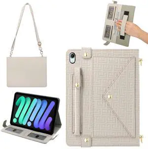 Handbag Case for iPad Mini 7 2024/Mini 6th Generation Case, Techcircle Elegant Crossbody PU Leather Folio Envelope Pocket Stand Cover with Hand Strap+Shoulder Strap+Pencil Holder+Card Slots, Off-White