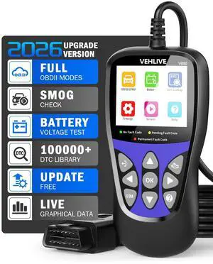 - Features: Vehicle Battery, Plug and Play, Full OBDII Functions, Live Data Logging, Data Print, One Key I/M Readiness, DTC Help, Built-In System