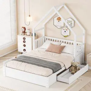 Wood Queen Size House Platform Bed with Guardrail and 2 Drawers, White