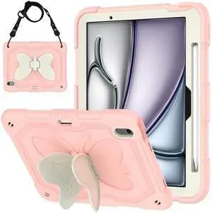 Case for iPad Air 11 inch M2 2024, Cute Butterfly Wings Shockproof Cartoon Silicone Kickstand Protection Cover with Strap for Apple iPad Air 6th Gen for Kids Boy Girl Women Gift (Pink)