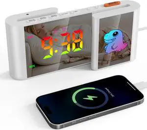 GIOFIMOK S-shaped Digital Alarm Clock, Dual Mirrored Display with Time and Cartoon Dinosaur, USB port, Easy Setting, Auto Dim, 12/24H, Fashional Clock for Bedroom, Living Room and More.