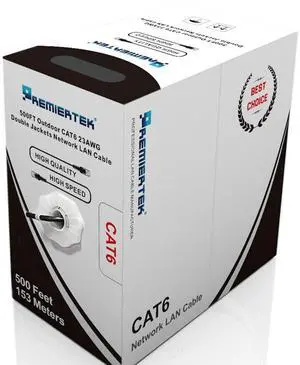 Premiertek Outdoor UV 500ft Double Jacket Cat6 23AWG CCA FTP 4-Pairs Premium Network LAN Cable Direct Burial UV Rated Waterproof Foil Shielded Black