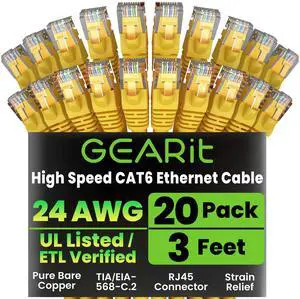 GEARit Cat 6 Ethernet Cable (20-Pack 3 Feet) Cat6 Network Patch, 10Gbps, RJ45, Snagless Cord, Gold-Plated Connectors, Internet for PC, TV, Tablet, Router, Printer, Servers, IT Data Center - Yellow