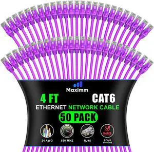 Maximm Cat 6 Ethernet Cable 4 Ft, (50-Pack) Cat6 Cable, LAN Internet and Network - UTP (Purple) 4 Feet