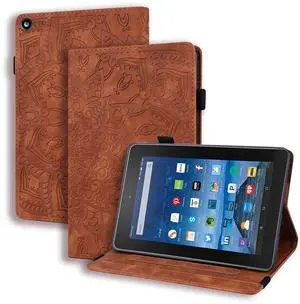 Folio Case for Fire HD 8.0" 2015/2016/2017/2018, Techcircle PU Leather Stand Soft TPU Back Cover Slim Fit Mandala Embossed Case with Card Holder for Kindle Fire HD 8 8th/7th/6th/5th Generation, Brown