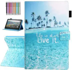 UUcovers Kindle Fire HD 8 Tablet Case (only Fit 10th Generation, 2020 Release) & Fire HD 8 Plus 8" with Stand Pencil Holder Auto Wake/Sleep Smart PU Leather Folio TPU Shockproof Cover, Beach Live it