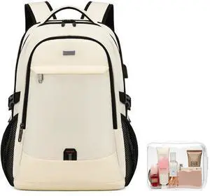 DUSLANG 17 Inch Laptop Backpack for Travel Water Resistant College Backpack for Women Laptop Bag with USB Charging Port and Clear Toiletry Bag Work Backpack,Beige A
