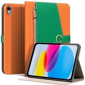 XFYKJIN Leather Case for iPad 11th Gen 11" (2025) & 10th Gen 10.9" (2022) - Premium Leather Feel w/Zippered Pocket, Secure Buckle, Auto Wake/Sleep & Adjustable Shockproof Stand (Orange/Green)