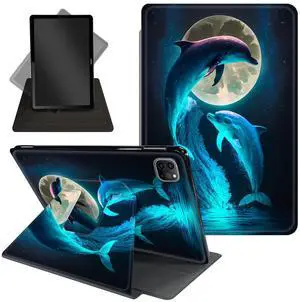 Case for iPad Pro 12.9 Inch 6th/5th/4th Gen (2022/2021/2020),360 Degree Rotating Protective Stand Cover with Auto Wake/Sleep,Cute Dolphins and Moon