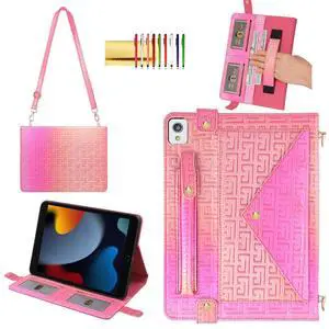 Shiny Case for iPad 9th 8th 7th Gen 10.2"/iPad Air 2019/iPad Pro 10.5, Techcircle Crossbody Iridescent Folio Stand Wallet Case with Pencil Holder+Card Slots+Hand Strap+Shoulder Strap, Shiny Rose Pink