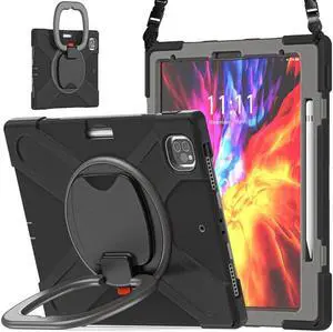 Case for Apple iPad Pro 12.9 Inch 2022 2021 2020 2018 6th/5th/4th/3th Generation, Heavy Duty Shockproof Case with Pencil Holder, Shoulder Strap, Hand Strap, Kickstand