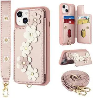 Compatible with iPhone 13 / iPhone 14 Wallet Case with Card Holder for Women, Kickstand, Crossbody Lanyard, Wrist Strap Flower Leather Flip Cover Designed for iPhone 13/14 6.1", Rose Gold