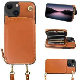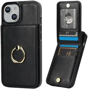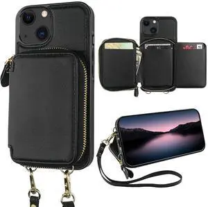 Crossbody Wallet Case for iPhone 13/14 with Lanyard Strap Card Slot Holder RFID Blocking Ring Kickstand,Magnetic Flip Folio Zipper Purse Case, PU Leather Cover Handbag,Black