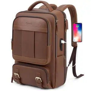 Tzowla Leather Laptop Backpack, Bag for Men and Women,Business Travel Work Rucksack Fits 15.6 Inch Laptop, Bookbag with USB and Type-C Charging Port-Brown