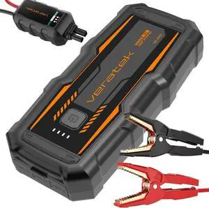 Features: vJump start vehicles up to 12L Gas/10L Diesel engines,including Hybrid cars., v400 lumen LED flashlight with 3 modes(SOS, SPOTLIGHT, STROBE)., v3.2-inch screen displays real-time battery status., v4000 Amps peak current cranking power., vPowerful & handy portable jump starter for car battery., v24 Months standby time., vBattery Life: 1000+ Cycles., vA 15 volt 10A port for powering any 15V or 12V DC devices, such asw air compressor, car fridge, car vacuum cleaner, and more., v100W max two-way super-fast charging supported. Fully charge in about 1.2 hours., vIP65 water-resistant & 94V0 flame retardant, vLarge battery capacity.