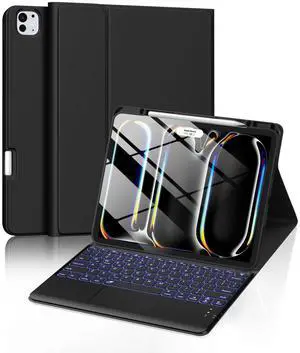 KARTICE Transparent Case with Wireless Keyboard for iPad Pro 11 Inch (M4,2024), 7 Colors Backlight, Multi-Touch Trackpad, 360 Rotating Stand Case with Pencil Holder for iPad Pro 11
