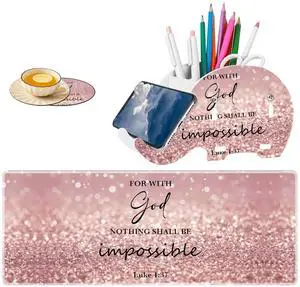 Mouse Pad Set, Large Mouse Pad (31.5 "x11.8)+ Elephant Pen Holder + Coaster Combination, Non-Slip Base, Gamer Table Pad, Suitable for Office and Home - Luke 1:37 Rose Gold Rainbow Glitter