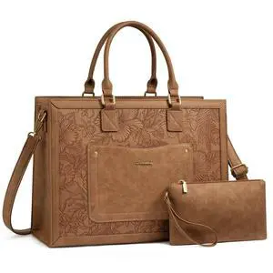 LOVEVOOK Laptop Tote Bag for Women, 15.6 Inch Work Bags, Vintage Leather Tote Bag, Waterproof Computer Bags with Clutch Purse, Large Capacity Messenger Bag for Teacher College Business Office