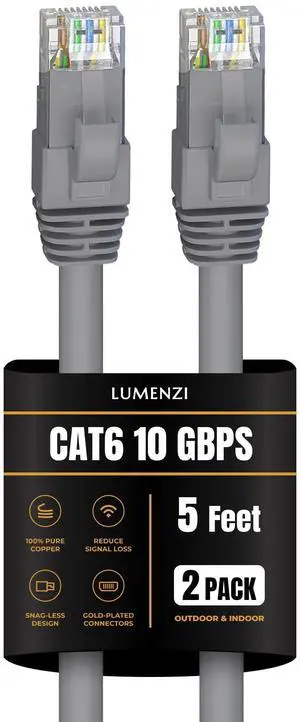 Lumenzi Cat 6 Ethernet Cable 5 FT in Grey 2 Pack 10 Gbps Speed Network Round Rj45 Outdoor Indoor Direct Burial Bare Copper LAN Patch Cable for Router Gaming PS5 XBOX Printer Computer CCTV Switch