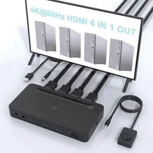HDMI KVM Switch 4 Port, 3 x USB 2.0, 3xUSB HDMI Switcher for 4 Computers Supports 4K/2K @30Hz HDMI KVM USB Switch, with 4 HDMI KVM Cables and 1 Desktop Controller