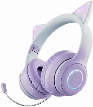 SOEWIOU Wireless Gaming Headset, Bluetooth 5.0 Foldable Wireless Gaming Headset, Cute Cat Ear LED Light Up Over-Ear Headphones, Lightweight Over-Ear Headphones(Purple)