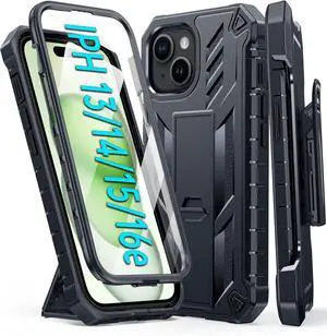 for iPhone 15 Phone Case: for iPhone 14 & 13 & 16e Case Military Shockproof Protective Rugged Cell Phone Cover with Kickstand & Belt-Clip Holster Heavy Duty Hard Cases 5G - 6.1 Inch Black