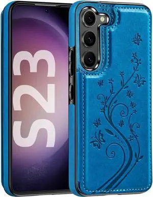 Korecase Wallet Phone Case for Samsung Galaxy S23 with Card Holder, Butterfly Floral PU Leather Back Flip Case -Blue